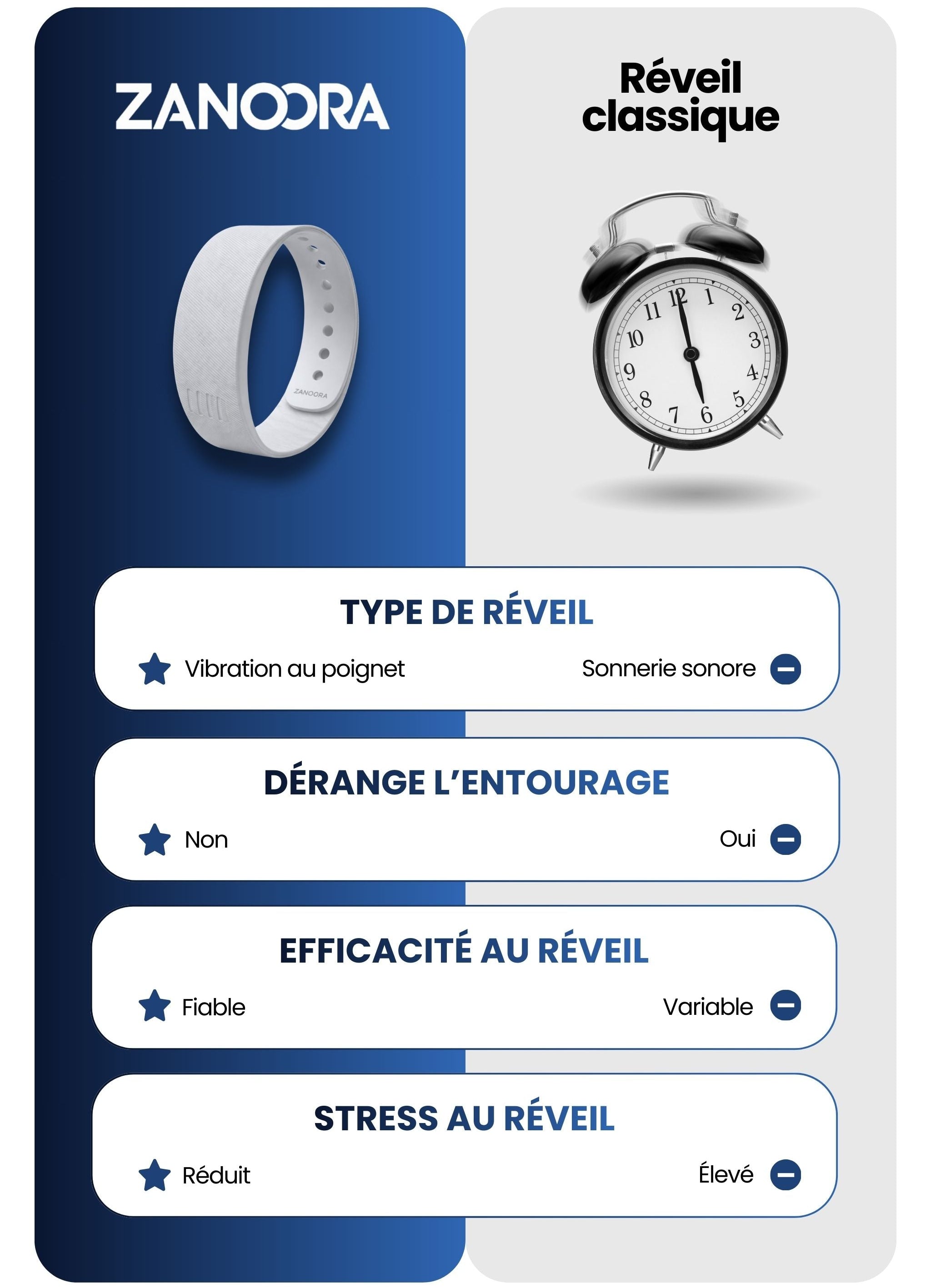 Contrairement aux alarmes sonores que le cerveau apprend à ignorer, le bracelet réveille par le toucher.